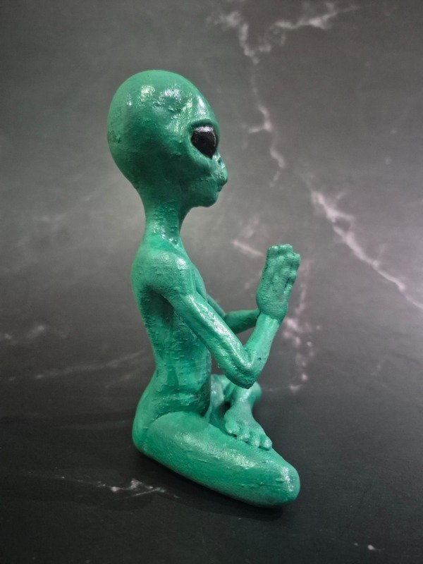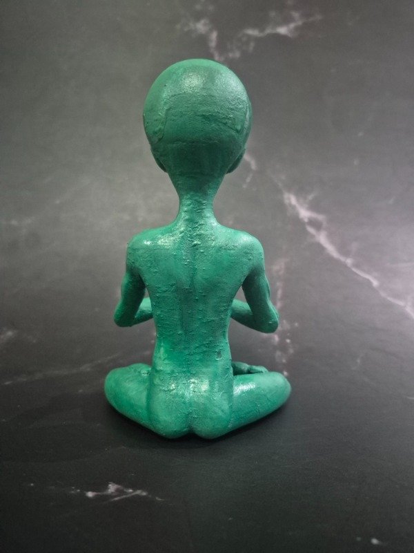 Este Buda E.T. está modelado en posición de meditación y pintado a mano con pigmentos fotoluminiscentes, que brillan en la oscuridad luego de absorber luz natural o artificial.